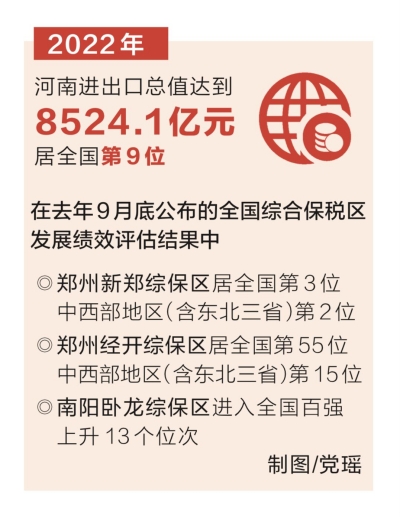 2022年,河南進出口總值在高基數(shù)上穩(wěn)定增長,達到8524.1億元,居全國第9位。其中,鄭州新鄭、鄭州經(jīng)開、南陽臥龍、洛陽四個綜保區(qū)對全省進出口總值的貢獻率超60%。