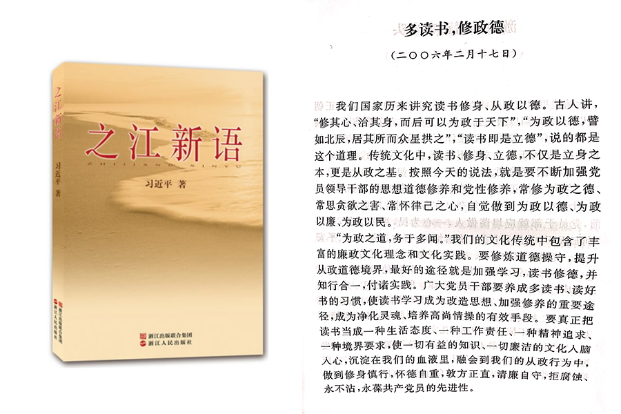 2006年2月17日,時任浙江省委書記的習(xí)近平用筆名“哲欣”在《浙江日報》“之江新語”專欄發(fā)表題為《多讀書,修政德》的文章。他說,我們國家歷來講究讀書修身、從政以德。廣大黨員干部要養(yǎng)成多讀書、讀好書的習(xí)慣,使讀書學(xué)習(xí)成為改造思想、加強(qiáng)修養(yǎng)的重要途徑,成為凈化靈魂、培養(yǎng)高尚情操的有效手段。