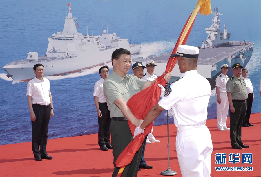 下午3時30分許,交接入列儀式開始,全場高唱中華人民共和國國歌,五星紅旗冉冉升起。儀仗禮兵護衛(wèi)著八一軍旗、命名證書,正步行進到主席臺前。習(xí)近平將八一軍旗、命名證書分別授予長征18號艇艇長、政治委員,大連艦艦長、政治委員,海南艦艦長、政治委員。三型艦艇的艦艇長、政治委員向習(xí)近平敬禮,從習(xí)近平手中接過八一軍旗、命名證書。習(xí)近平同他們合影留念。