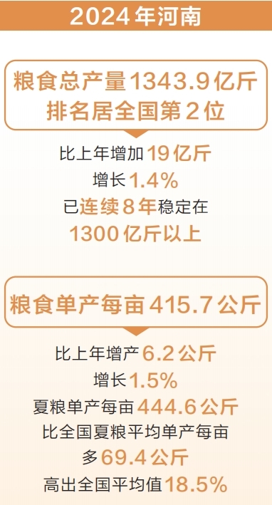 ??12月15日,記者獲悉,根據國家統(tǒng)計局河南調查總隊夏糧、秋糧產量抽樣調查樣本實割實測和糧食播種面積遙感監(jiān)測結果,經國家統(tǒng)計局核定,2024年河南糧食總產量1343.9億斤,排名居全國第2位。河南糧食總產量已連續(xù)8年穩(wěn)定在1300億斤以上,為鞏固和增強經濟回升向好態(tài)勢、推動高質量發(fā)展提供了有力支撐。